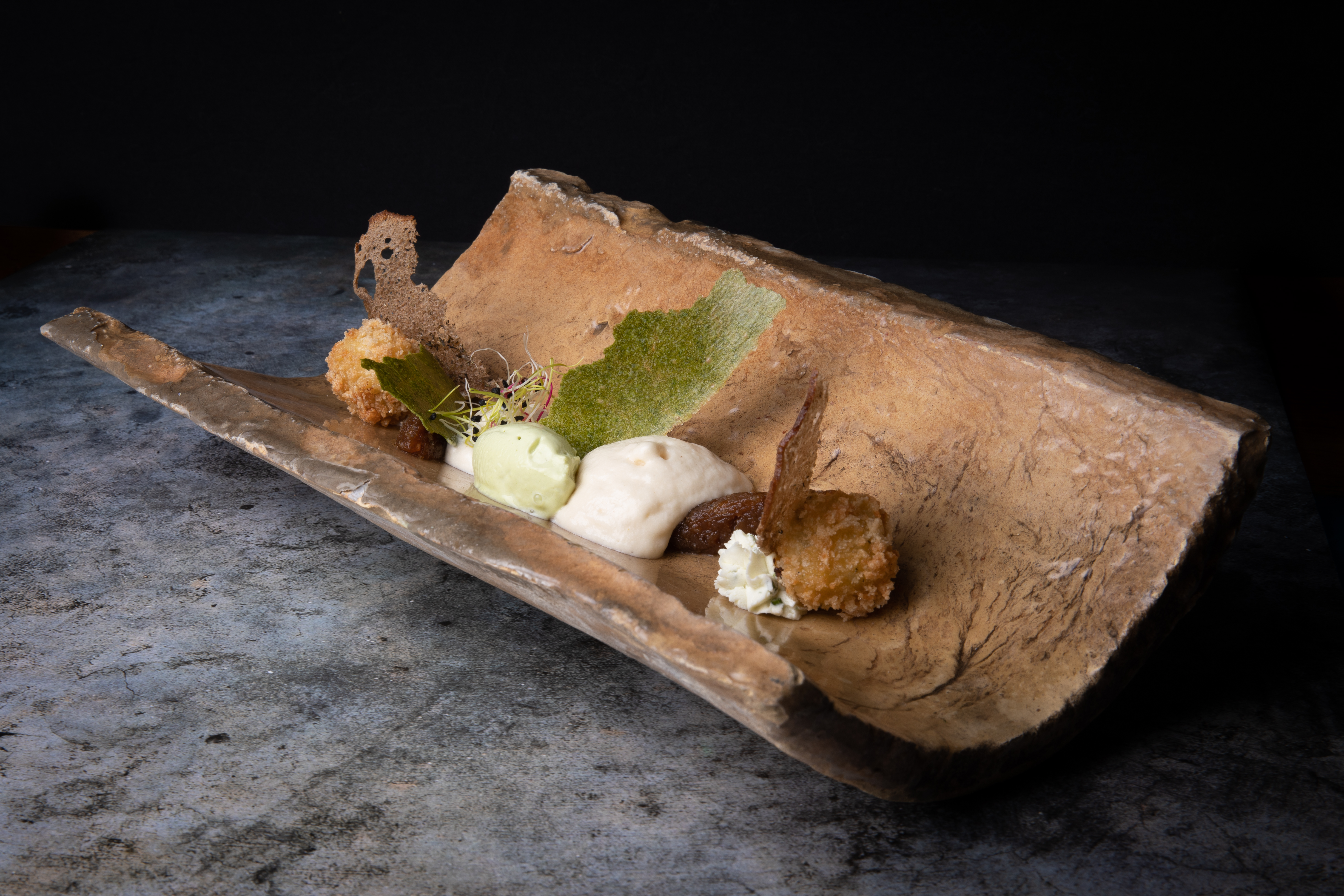 Espuma de Chèvre de Banon, Crème de Chèvre frais, Cromesquis, Glace Chèvre & Ail des Ours, Condiment Oignon Doux des Cévennes.