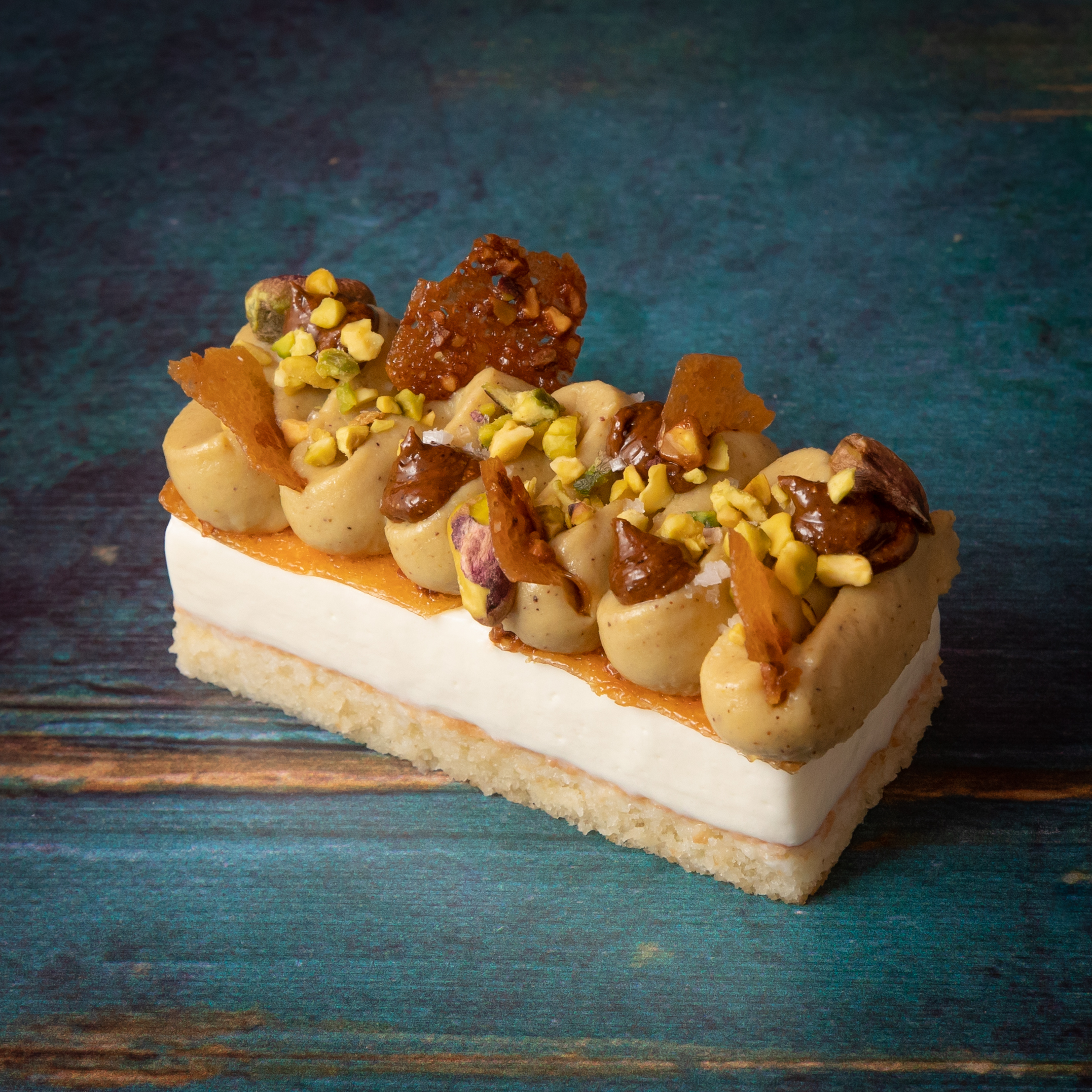 Apple, Pear, like Tatin, Vanilla Cream, Almond biscuit, Peanut, Toffee Sauce.