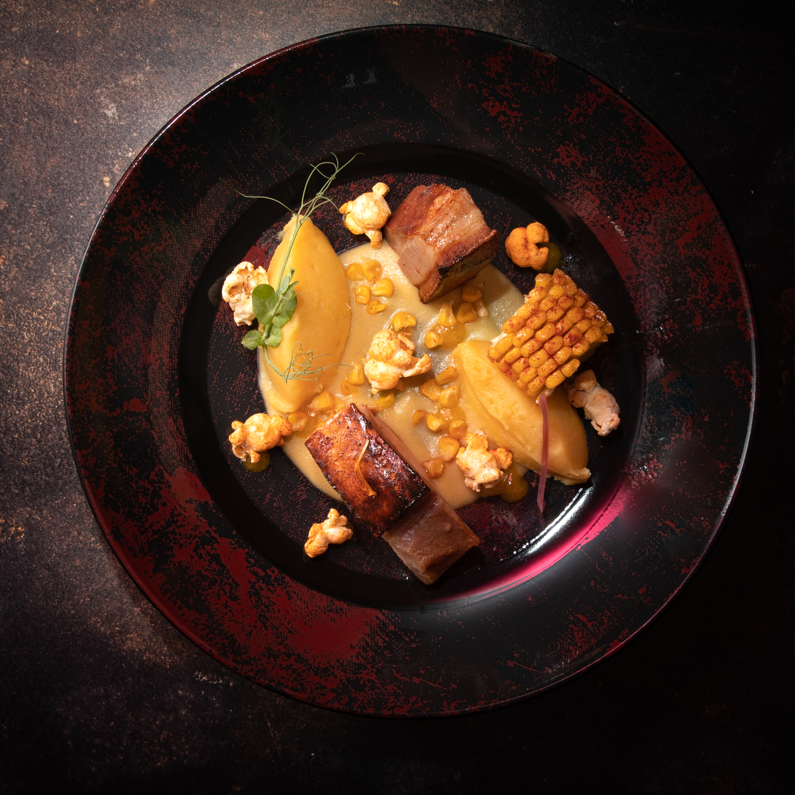 Échine de Porc rôti, Polenta, Noisette, Artichaut, Farigoule.