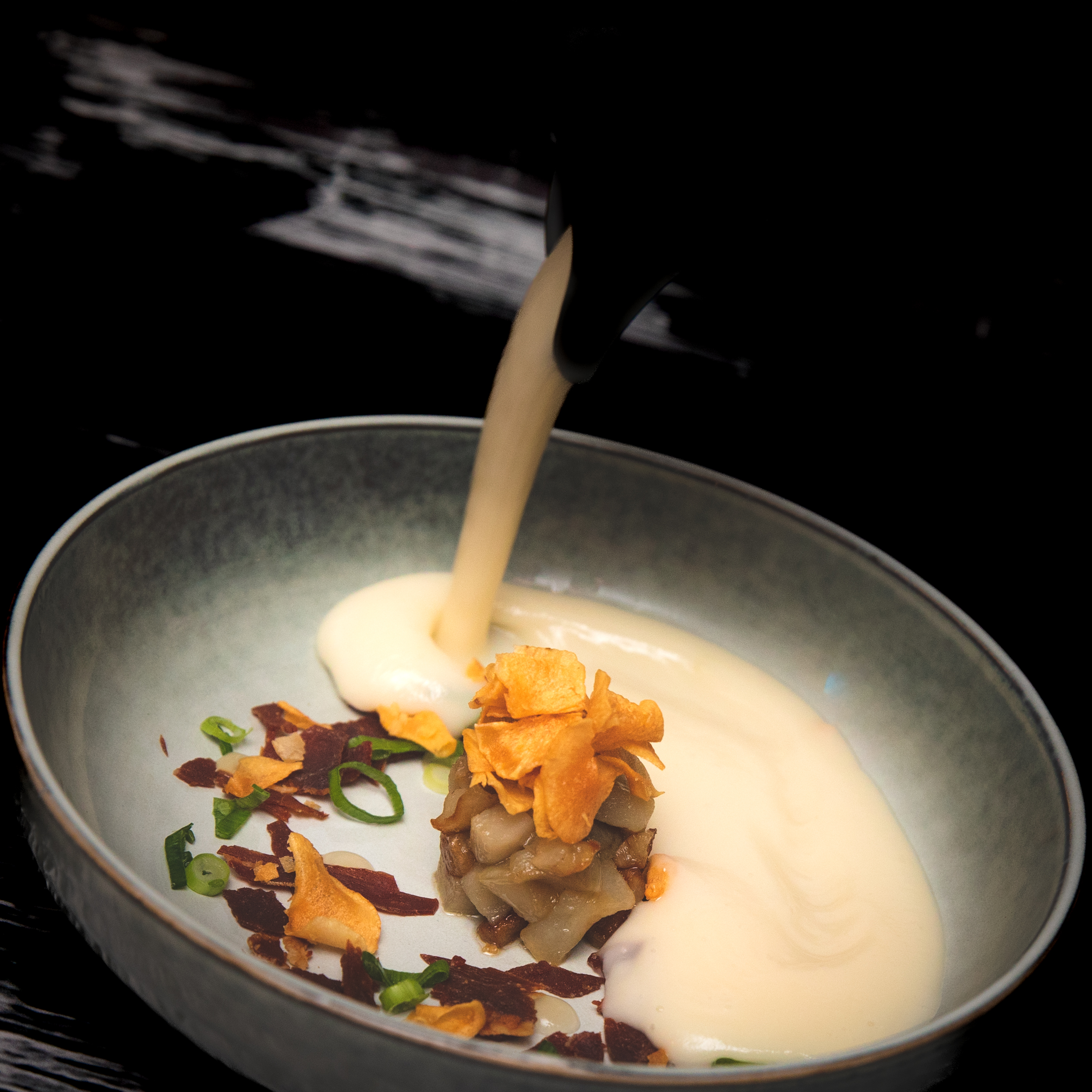 Cabbage Soup, Beer, Timut Pepper Cream, Cumin Crumble, Pancetta.