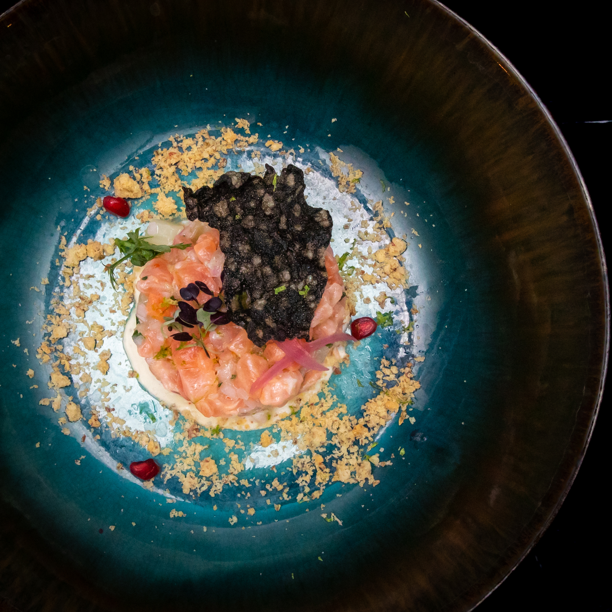 Salmon Tartar, Fenel Crumble, Sesame, White Cheese.